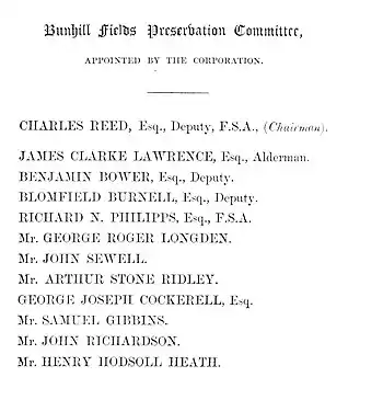 In a move to prevent the land from being built upon on expiry of a longstanding lease, the Corporation of the City of London formed a special Bunhill Fields Burial Ground Committee in 1865, which became formally known as the Bunhill Fields Preservation Committee. The committee, appointed by the corporation, consisted of twelve advisors under Reed's chairmanship. Following the work of the committee, the City of London Corporation obtained an Act of Parliament in 1867 for the Preservation of Bunhill Fields Burial Ground as a public open space with seating, gardens, and for the restoration of some of its worthiest monuments, including one to Daniel Defoe funded by The Christian World and unveiled by Reed. The new park was opened by the Lord Mayor on 14 October 1869.[14]