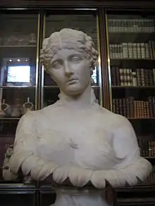 The so-called Bust of Clytie[lower-alpha 5] perches on the small writing-table, in Zoffany's assembly of the Townley marbles. It was extensively reproduced in marble, plaster, and the white bisque porcelain called parian ware for its supposed resemblance to Parian marble. Goethe owned two casts of this.[23] The Bust of Clytie was apparently Townley's favourite sculpture and the one he took with him when he was forced to flee his home during the anti-Catholic riots of 1780.