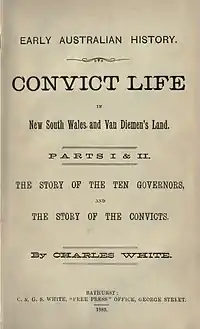 White had a passionate interest in writing about Australian history. He scrupulously collected material and records to use as a basis for his historic writings.[1] In the late 1880s Charles White’s "lengthy series of historical sketches", under the title 'Early Australian History', began to be published in the Bathurst Free Press. Described as articles "bearing upon the work of Australian colonisation and convict life in New South Wales and Van Diemen’s Land", the publishing project was locally advertised, including in the rival newspaper Bathurst Post. The first part of 'Early Australian History' was published on 6 October 1888.[8] White used the pseudonym 'The Chatterer' for these early articles.[9] In 1889 Parts I and II of White’s 'Early Australia History' were released in book form as Convict Life in New South Wales and Van Diemen’s Land, printed in the White brothers' newspaper office at Bathurst.[10] Charles White’s historical writings display “painstaking scholarship and a fluent, uncluttered style free of romanticism”.[1]
