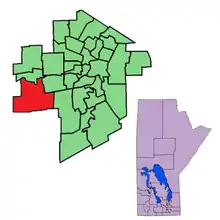 Charleswood was a provincial electoral division in the Canadian province of Manitoba. It was created by redistribution in 1968, and formally existed from the provincial election of 1969 until that of 2019. The riding was in the westernmost tip of Manitoba's capital and largest city, Winnipeg.