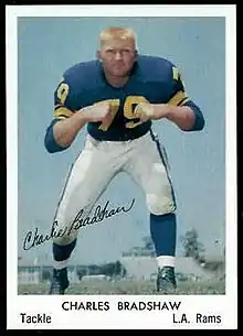 Charles Marvin Bradshaw (March 13, 1936 – January 23, 2002) was an American football offensive tackle who played eleven seasons in the National Football League, mainly for the Pittsburgh Steelers. He served for a time as the head of the NFL Players Association. Bradshaw earned a law degree during the offseason and after his career practiced law in Dallas, Texas until the time of his death from cancer.[1]