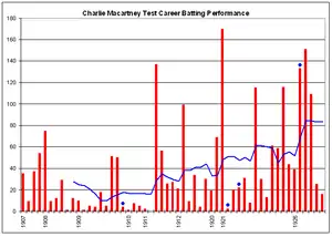 Macartney's Test career batting performance, showing the marked improvement post World War I. The red bars indicate an individual innings, while the blue lines indicate the batting average in the ten most recent innings. The blue dots indicate innings in which he remained not out.[16]