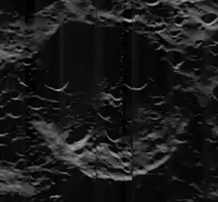 The interior floor has also not escaped the bombardment, and multiple small craters lie across the interior, in some places overlapping previous impacts. There are two patches of the interior floor that are relatively free from notable impacts. One is adjacent to the northern part of the interior floor and the other is in the southwest part of the floor.