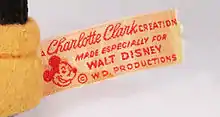 Shortly following the release of Walt Disney's Steamboat Willie, Clark designed the first Mickey Mouse doll in early 1930.[1][2] She obtained permission from the Disney Studio,[3] and the dolls began to appear in the Los Angeles area stores. Demand soon exceeded her ability to produce the dolls, so Clark designed sewing patterns so that customers could make their own dolls at home. Walt and Roy Disney were so pleased with Charlotte's Mickey Mouse doll that they rented a building on Hyperion Avenue[4] near the studio, titled the Doll House. Here Charlotte and six other seamstresses produced 300 to 400 dolls per week. These first production dolls were rubber-stamped on the underside of the doll's foot: "Walt Disney's Mickey Mouse Design Patent Applied For". Clark's character creations set the design standard for all Disney merchandising for dolls thereafter. As the collection of Disney characters grew, Clark created patterns for Donald Duck, Pluto, Minnie Mouse[5] and other popular characters which were licensed and produced by manufactures worldwide.[6]