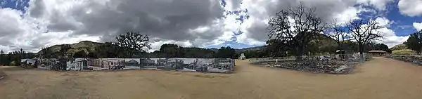 For the series' large-scale exterior look, the producers drew inspiration from the work of John Ford, who shot four of his Western films in Castle Valley, east of Moab.[82] In early 2014, Nolan visited southern Utah with key crew members and a location scout to explore the possibility of filming there, and promptly fell in love with the place.[81] Location shooting for the pilot episode later occurred over five days in southern Utah,[81] including Castle Valley.[82] Most Utah locations, like Dead Horse Point State Park, were "walk-in" areas where both cast and crew were required to hike in and out with all their gear.[81] Horseback riding scenes were filmed at a private ranch, where the filmmakers were not subject to as many restrictions as when working on public land.[85] To seamlessly blend California sets with Utah scenery, set walls were shipped to Utah so that they could be used to film reverse angles of scenes originally filmed in California.[85] For example, conversations on the exterior balcony of Westworld's operations center were shot on a balcony at the Skirball Center facing towards the center, then reverse angles over the shoulders of the cast members were shot at Dead Horse Point, to make it seem as if the operations center was located on top of the state park's steep cliffs.[76][81][85] The train interior scenes were created by mounting the entire train car set on the back of a flatbed truck and driving the truck back and forth along Utah State Route 128.[81]