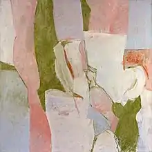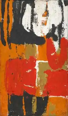 Park worked on both paper and canvas. She made gouaches, oils, collages, and acrylics. Her paintings tended to be smaller than those of other abstract expressionist artists.[7]: 8 In the early 1950s she often made black and white as well as colored gouache paintings on paper and also made gestural drawings in this period.[7]: 8 [31] A critic said of this work, in general, that "Ms. Park effortlessly reconciled painting and drawing, deriving a lively formal vocabulary from clusters of loops and spheres."[30] Of the work on paper in particular, another critic wrote: "Complex interactive layering animates the painted surfaces, which often conceal as much as they reveal. Organic and calligraphic shapes jockey for position, yet are held firmly in place by implicit structure."[32] Later in the decade she made some larger oil paintings mostly employing subtler color choices than before. Her handling of oils at this time included the use of a palette knife to apply and scrape off pigment.[7]: 8 Discussing this technique, a critic for the New York Times said she scraped, built up, and revised to create "a varied, sensuously appealing surface."[19] At the end of the decade she made collages, often cutting up and re-assembling parts of earlier paintings.[7]: 9 During the 1960s she leaned toward square shaped paintings having softer colors than previously.[7]: 9