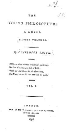 After leaving her husband, Smith moved to a town near Chichester and decided to write novels, as they would make more money than poetry. Her first one, Emmeline (1788), was a success, selling 1500 copies within months. She wrote nine more in the next ten years: Ethelinde (1789), Celestina (1791), Desmond (1792), The Old Manor House (1793), The Wanderings of Warwick (1794), The Banished Man (1794), Montalbert (1795), Marchmont (1796), and The Young Philosopher (1798). Smith was beginning her novelist career at a time when women's fiction was expected to focus on romance and to focus on "a chaste and flawless heroine subjected to repeated melodramatic distresses until reinstated in society by the virtuous hero".[4] Although Smith's novels employed this structure, they also included political commentary, notably support of the French Revolution through her male characters. At times, she challenged the typical romance plot by including "narratives of female desire" or "tales of females suffering despotism".[4] Her novels contributed to the development of Gothic fiction and the novel of sensibility.[3]