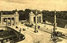 Charlottenburg Gate (German: Charlottenburger Tor) with Charlottenburg Bridge (Charlottenburger Brücke) is a Neo-Baroque structure in the Charlottenburg district of Berlin. Erected in 1907 at the behest of the then independent City of Charlottenburg, it was meant as a counterpart to Berlin's Brandenburg Gate.