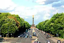 listen), English: 17th of June Street), is a street in central Berlin, the capital of Germany. Its name refers to the 17 June 1953 uprising in East Germany. It is the western continuation of the boulevard Unter den Linden. It runs east–west through the Tiergarten, a large park to the west of the city centre. At the eastern end of the street is the Brandenburg Gate and the Platz des 18. März, it then passes the Soviet War Memorial before passing either side of Victory Column (Siegessäule) in the middle of the park, and out of the park through the Charlottenburg Gate, terminating about half a kilometre later at Ernst-Reuter-Platz. The street is a section of the main western thoroughfare radiating out from the centre of Berlin so the road continues to the west of Ernst-Reuter-Platz, the first section of which is called Bismarckstraße.