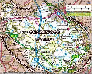 The area of hills and open land known as Charnwood Forest has no jurisdictional boundary (the Borough of Charnwood covers roughly two thirds of Charnwood Forest, and the eastern half of the borough is not part of the forest). Furthermore, despite its name, Charnwood was never a royal forest, and was never subject to forest law.[3] So although it is an ancient and well-established locality,[4] it has only recently been officially defined, by the Natural England National Character Area (NCA) process,[5][6] which takes a somewhat wider definition than many previous attempts to define the area.[7][8]