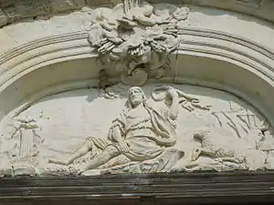 - The monumental entrance gate is in the north wall of the monastery. From the 12th century, it is topped by a tympanum decorated with a bas-relief on the outside of St. Bruno (founder of the Carthusian order) and inside John the Baptist praying, the patron saint of the monastery.[14]