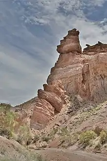 Charyn Canyon (also known as Sharyn Canyon, Kazakh: Шарын шатқалы, Sharyn shatqaly) is a canyon on the Sharyn River in Kazakhstan (200 kilometres (120 mi) east of Almaty, close to the Chinese border). The canyon is roughly 154 kilometres (96 mi) in length.[1] It is part of the Charyn National Park (established on 23 February 2004), and is located within the territory of the Uygur District, Raiymbek District and Enbekshikazakh District (of the Almaty Province). The canyon features peculiar and colourful formations in the likeness of chapels, towers, animals, etc., each formed by the weathering of sedimentary rock. Though it is much smaller than the Grand Canyon, it has been described as being equally impressive.[1][2][3][4]