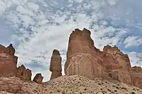 The geological formation of the canyon consists of sedimentary red sandstone that has been subject to the "atmogenic process", defined as "atmospheric origin by condensation, wind action, or deposition from volcanic vapors".[5] This water and wind erosion has resulted in rock formations which resemble colourful sculptures.[1][2][6] One section of the canyon is known as the Valley of Castles (Dolina Zamkov) for its unusual rock formations.[1]