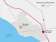 Nevertheless, the original route to Mar del Plata used tracks that crossed downtown Chascomús, with more than 17 level crossings existing.[4] That also meant trains had to run at very low speed when crossing Chascomús in order to prevent accidents, generating significant delays in the time of journey. To put an end to this, a new building that operated as both railroad and bus terminus, was projected during the Presidency of Raúl Alfonsín. The original project included construction of a new route for the tracks, moving them to a suburban area of the city to prevent accidents. The successive economic crisis in Argentina halted construction, until the station was indefinitely abandoned without being finished.[5]