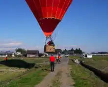 The next step in a hot air balloon flight is unpacking the balloon from its carrying bag, laying it out on the ground, and connecting it to the basket and burner. A fan, often gasoline-powered, is used to blow cold (outside) air into the envelope. The cold air partially inflates the balloon to establish its basic shape before the burner flame is aimed into the mouth heating the air inside. A crew member stationed opposite the mouth, holds a rope (crown line) tied to the apex (crown) of the envelope. Some balloons, AX7 and larger, may have two (or more) crown lines.[8] The "crown-man" role is twofold: one is to prevent the envelope from excessive sway, and two is to prevent the envelope from rising before it is sufficiently buoyant. Once the balloon is upright, pilot and passengers climb into the basket. When the pilot is ready for launch, more heat is directed into the envelope and the balloon lifts off.