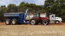 A chaser bin, also called grain cart, bank out wagon or (grain) auger wagon, is a trailer towed by a tractor with a built-in auger conveyor system, usually with a large capacity (from several hundred to over 1000 bushels; around 15 tonnes (33,000 lb) is average).[1]