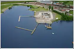 Overhead view of Chasewater Watersports Centre with chasewater railway in the background.