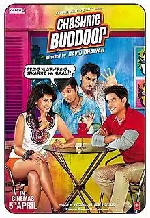 Chashme Baddoor is an Indian 2013 Hindi language slapstick comedy film directed by David Dhawan and written by Sajid and Farhad Samji. An official remake of the 1981 film Chashme Buddoor, it was produced by Viacom 18 Motion Pictures[2] and stars Ali Zafar and debutante Taapsee Pannu with Divyenndu and Siddharth in lead roles.[3] The film was released on 5 April 2013