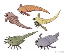 Chasmataspidids, sometime referred to as chasmataspids,[1][2][3] are a group of extinct chelicerate arthropods that form the order Chasmataspidida. Chasmataspidids are probably related to horseshoe crabs (Xiphosura) and/or sea scorpions (Eurypterida),[4][1] with more recent studies suggest that they form a clade (Dekatriata) with Eurypterida and Arachnida.[5][6][7][8] Chasmataspidids are known sporadically in the fossil record through to the mid-Devonian,[9] with possible evidence suggesting that they were also present during the late Cambrian.[1] Chasmataspidids are most easily recognised by having an opisthosoma divided into a wide forepart (preabdomen) and a narrow hindpart (postabdomen) each comprising 4 and 9 segments respectively.[1][10] There is some debate about whether they form a natural (i.e. monophyletic) group.[3][1][4]