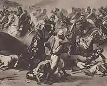 In addition to numerous campaigns in North Africa, these colorful regiments also served in the Crimean War, Second Italian War of Independence, Franco-Prussian War, Indochina, France's invasion of Mexico, Dahomey (1892), Madagascar (1895) and both world wars.[4] The 1st and 4th Regiments of Chass. d'Af. distinguished themselves by securing the flank of Lord Cardigan during the ill-fated Charge of the Light Brigade.[5] On this and other occasions they used their characteristic African tactic of advancing rapidly in open order,[6] in contrast to the rigid lines of the Light Brigade.