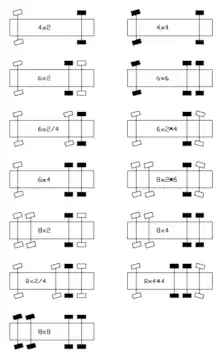 Often the formula A × B × C is used. Even if the information contained by C is needless, it means that only front axles are steered. This can give information about the distribution of axles. For example, provide manufacturers the chassis configuration 8×4×4 to show that the vehicle has two steered front axles and two driven rear axles, compared to the chassis configuration 8×4/4 where the vehicle has one steered front axle, one steered rear axle (the fore axle) and two driven rear axles (the aft axles).