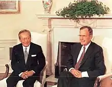 In 1974, Chatichai and his in-laws Pramarn Adireksarn and Siri Siriyothin—also major generals—founded the conservative and aggressively anti-communist Thai Nation Party (Chart Thai).[14] It ran in the January 1975 general election, the first democratic election after the end of military dictatorship, and became the third-strongest party. Chatichai was elected member of parliament, representing a constituency in Nakhon Ratchasima Province. The Thai Nation Party joined a government coalition under Kukrit Pramoj. Chatichai served as minister of foreign affairs from 17 March 1975 to 21 April 1976.[15] After the snap election in April 1976, in which the Thai Nation Party expanded its share of seats significantly, he was minister of industry in the government of Seni Pramoj until it was overthrown by a military coup d'état after the Thammasat University massacre of 6 October 1976. From 1980 to 1983, Chatichai served as industry minister under Prime Minister Prem Tinsulanonda. After three years of opposition, the party returned to government and Chatichai was deputy prime minister under Prem.[10]