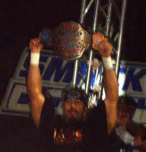 Soon after returning to the active roster, Guerrero was aligned with his uncle Eddie, forming the tag team Los Guerreros.[27] In contrast to his previous WCW storyline with his uncle, Guerrero fully adopted his uncle's policy of "Lie, Cheat and Steal" to win matches as part of the gimmick. Los Guerreros won the tag team championships at Survivor Series, when they defeated Kurt Angle and Chris Benoit and Edge and Rey Mysterio in a Triple threat tag team elimination match. The duo turned face due to their popularity. On the February 6, 2003 episode of SmackDown!, Los Guerreros lost their tag team championships to Team Angle. At WrestleMania XIX, they were again defeated by Team Angle in a triple threat match for the tag team titles, also involving the team of Benoit and Rhyno. They continued to feud with Team Angle and won the championships back on the September 18 episode of SmackDown!. One month later, they lost the titles to Basham Brothers.[28] After losing their tag team championships, Guerrero became jealous of his uncle's growing popularity and WWE Championship ambitions, turned on Eddie, broke from the team, and turned heel again.[29] He was soon joined by his father Chavo Sr. who sided with his son instead of his brother.[30] Guerrero and his father teamed together to defeat Eddie and Kurt Angle on January 22, 2004 episode of SmackDown![31] Eddie, however, defeated Guerrero at the 2004 Royal Rumble to end their feud.[32]