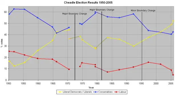 1983–2010: The Borough of Stockport wards of Cheadle, Cheadle Hulme North, Cheadle Hulme South, East Bramhall, Heald Green, and West Bramhall.[5][6]