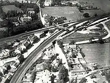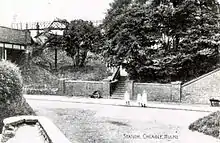 The lines to Crewe and Stoke-on-Trent were electrified in 1960 and 1967 respectively.[10] In 1963, due to the growing amount of traffic travelling down Station Road, it was decided that the parts of the road that pass under the bridges should be widened, as they were becoming a bottleneck. The bridge carrying the line to Stoke was upgraded first. The road under it was more than doubled in width, and the bridge height was increased by 3 feet (0.9 m) allowing double-decker buses to pass underneath.[16]