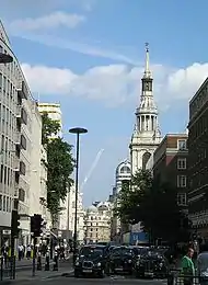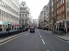 Cheapside is a street in the City of London, the historic and modern financial centre of London, which forms part of the A40 London to Fishguard road. It links St. Martin's Le Grand with Poultry. Near its eastern end at Bank junction, where it becomes Poultry, is Mansion House, the Bank of England, and Bank station. To the west is St. Paul's Cathedral, St Paul's tube station and square.