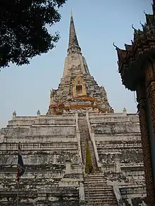In 1569, having taken Ayutthaya, King Bayinnaung of Hongsawadi (now part of Myanmar) built a large chedi, next to the Buddhist temple of Wat Phukhao Thong, to commemorate his victory. The chedi was never completed, only the base was ever constructed when in 1587, Prince Naresuan, to commemorate his victory over the Burmese in 1584 following Ayutthaya's liberation from Burma, decided to build a Thai-style chedi over the base of the still-unfinished chedi.[2] Over the next two centuries the chedi fell into disrepair. In a restoration during the reign of King Boromakot (ruled 1733–1758) a new chedi in Thai style, having a square plan with indented corners, was built on the base of the ruin.[3]