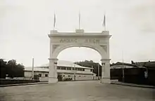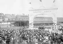 Another initiative of Mrs Seager, the Arch straddled Station Road, a private thoroughfare serving the Railway Station, which passed the Cheer-up Hut before emerging at King William Road. Built at a cost of £1,000, construction of the Arch began in October 1918, and was officially opened 29 January 1919. Believed to be the first such structure erected in Australia in recognition of the Anzac forces,[23] it was demolished June 1925 after Railways Department declared it unsafe.[24] During its few years of existence many tens of thousands of servicemen passed through its portal.