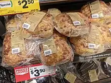 Cheese and bacon rolls are popular bread snacks originating in Australia.[1] Although similar to other bread dishes they are fairly simple to make and usually a dough topped with cheese and bacon then baked. Some regional varieties include tomato or barbeque sauce as a topping or stuffed cheese, and they can be eaten with soup.[2][3]