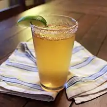 A michelada (Spanish pronunciation: [mitʃeˈlaða][1]) is a Mexican drink made with beer, lime juice, assorted sauces (often chili-based), spices, and chili peppers. It is served in a chilled, salt-rimmed glass. There are numerous variations of this beverage throughout Mexico.[2][3]