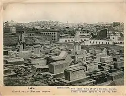 The August issues of Baku newspaper Kaspi in 1882 noted that the location of the cemetery in the immediate vicinity of the residential buildings was harmful for the population.[1][8] The newspaper also noted that the cemeteries, particularly the Russian one, begins from the roofs of the outer city houses and to enter the cemetery from the embankment, it is enough to climb the front step of the first house, in order to jump directly from the last step to the graves, and a small step from the roof of any of those houses is enough to end up in the cemetery.[1]