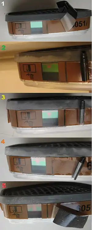 The documents[24][25] describe a non-destructive way to determine the remaining service life of new and used gas cartridges. Polluted air was pumped through the cartridge. The degree of purification of air depends on how much-unsaturated sorbent is in the cartridge, therefore, accurate measurement of gas concentration in the cleaned air allows one to estimate the amount of the unsaturated sorbent. Polluted air (1-bromobutane) was pumped for a very short time, and therefore, such tests do not reduce the service life considerably. The sorption capacity decreased due to absorption of this gas by about 0.5% of the sorption capacity of a new cartridge. The method was also used for 100% quality control of the cartridges manufactured by the English firm Martindale Protection Co. (10 microliters 1-bromobutane injected into the air stream), and to check the cartridges issued to workers in firms Waring, Ltd. and Rentokil, Ltd. This method was used in the Chemical Defence Establishment in the early 1970s. The experts who developed this method, received a patent.[26]