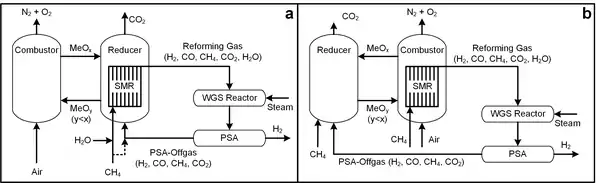 In the SMR with chemical looping combustion (CLC-SMR) concepts shown in Fig 2,[15][16] the syngas production is carried out by the SMR in a tubular catalytic reactor while the chemical looping combustion system is used to provide the heat for the catalytic reaction. Depending on which chemical looping reactor is used to provide the SMR reaction heat, two CLC-SMR schemes can be configured. In Scheme 1 (Fig 2a), the reaction heat is provided by the reducer (fuel reactor). In Scheme 2 (Fig 2b), the reaction heat is provided by the combustor (air reactor). In either scheme, the combustion of metal oxide by air in the chemical looping system provides the heat source that sustains the endothermic SMR reactions. In the chemical looping system, natural gas and the recycled off-gas from the pressure swing adsorption (PSA) of the SMR process system are used as the feedstock for the CLC fuel reactor operation with CO2 and the steam as the reaction products. The CLC-SMR concepts have mainly been studied from the perspective of the process simulation. It is seen that both schemes do not engage directly the chemical looping system as a means for syngas production.