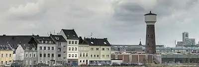 On 24 May 1892, the Vorster & Grüneberg Kommanditgesellschaft was renamed into Chemische Fabrik Kalk GmbH (CFK) and converted into a company with limited liability (GmbH).[14] It was one of the first limited liabilities companies in the German Empire as the law on companies with limited liabilities was adopted only one month earlier. On 7 June 1894, the last surviving founder Hermann Julius Grüneberg dies. His son Richard Grüneberg succeeds him and joins the management board of the company.[7] After 1900, the production of potassium carbonate ceased due to competitive pressure. Instead, the company began to produce sodium carbonate using the Solvay process. In 1902, the Düngerfabrik C. Scheibler & Co. was incorporated, and a year later the last remaining factory in the Staßburg region, the potassium chloride factory in Leopolshall was sold. To guarantee the water supply in the main factory in Kalk a water tower with an integrated chimney and a height of 43.6 metres (143 ft) was built. This water tower should dominate the skyline of Kalk for the next one hundred years.[15]