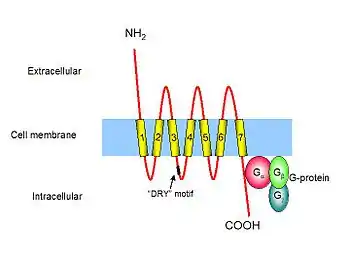 Chemokine receptors are cytokine receptors found on the surface of certain cells that interact with a type of cytokine called a chemokine.[1][2] There have been 20 distinct chemokine receptors discovered in humans.[3] Each has a rhodopsin-like 7-transmembrane (7TM) structure and couples to G-protein for signal transduction within a cell, making them members of a large protein family of G protein-coupled receptors. Following interaction with their specific chemokine ligands, chemokine receptors trigger a flux in intracellular calcium (Ca2+) ions (calcium signaling). This causes cell responses, including the onset of a process known as chemotaxis that traffics the cell to a desired location within the organism. Chemokine receptors are divided into different families, CXC chemokine receptors, CC chemokine receptors, CX3C chemokine receptors and XC chemokine receptors that correspond to the 4 distinct subfamilies of chemokines they bind. Four families of chemokine receptors differ in spacing of cysteine residues near N-terminal of the receptor.[4]