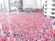 On 1 September 2006, political activist Shih Ming-te launched an anti-corruption campaign. The movement accused Chen of corruption and asked for his resignation. By 7 September, more than one million signatures were collected, each with a donation of NT$100 (approximately US$3.00).[37] On 9 September, tens of thousands of people demonstrated in the streets of Taiwan, wearing red. According to organisers, around 200,000 to 300,000 people joined the protest outside the presidential offices, but the police used aerial photography crowd counting techniques to put the number at about 90,000.[38] Shih Ming-teh confirmed that most of his supporters are from the pan-Blue coalition in a September interview in The New York Times.