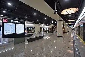 Chenchun Road (simplified Chinese: 陈春路; traditional Chinese: 陳春路; pinyin: Chénchūn Lù) is a station on Line 13 of the Shanghai Metro,[1] part of phase two of the line. Located at Hunan Road and Chenchun Road in Pudong, Shanghai, the station opened with the rest of phases 2 and 3 of Line 13 on 30 December 2018.[2][3]