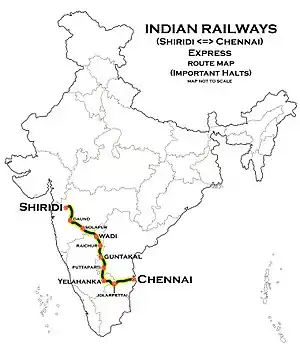 The 22601 / 02 Chennai Central–Sainagar Shirdi Superfast Express runs from Chennai Central via Arakkonam Junction, Katpadi Junction, Krishnarajapuram, Sathya Sai Prasanthi Nilayam, Guntakal Junction, Wadi Junction, Solapur, Daund Junction, Ahmednagar, Puntamba to Sainagar Shirdi.