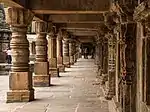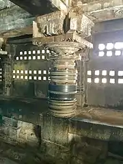 The mandapa (hall) is supported by lathe turned pillars.[37] The pillars, except two of them, are of the same size. All of them, except four in center, have five mouldings from common life themes stacked in sequence: disc, bell, pot, wheel and umbrella. The four set of central square pillars of the Navaranga have yakshas and brackets, which have been damaged or have disappeared. The two pillars to the east of the central square are shaped as a 32 pointed-star.[36][37]