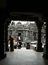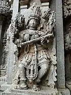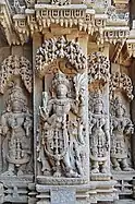 The Keshava temple at Somanathapura faces east and is enclosed in a walled courtyard with a major gate (mahadvara).[18] Outside the walls before the gate stands a tall pillar, which once had a Garuda statue on top, now missing. Inside the gate, to the left are vertical standing inscription stones. These stones have the form of the hero stones, with the top decorated with Hindu iconography as well as miniature reliefs of Keshava, Janardhana and Venugopala. The inscription is in old Kannada. The small entrance mandapa is supported by lathe-carved soapstone pillars.[3][18] The temple is carved from soapstone, a green-grey chloritic schist material that is soft in quarry but hardens when exposed to air. This is not locally available and must have been imported from another part of South India. It enabled the artists to shape and carve out intricate details for the artwork.[19][20]