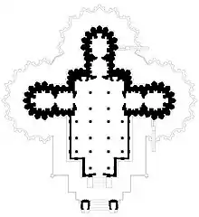The temple has a large open public courtyard surrounded by the walled enclosure, with the main three-towered temple in the center. The courtyard wall frames a rectangular veranda and an array of small shrines.[5][18][21]