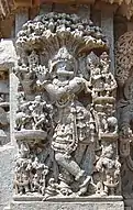 The reliefs showing common life of the people include festive scenes, dancers in various mudras, musicians with 13th century musical instruments, couples in courtship and sexual scenes, mothers nurturing babies, hunters and other professionals with pets such as dogs, soldiers, yogi, rishi, individuals in namaste posture, couples praying and others. These reliefs also include numerous friezes showing the story of Prahlada, Hiranyakashipu and Vishnu avatar Narasimha.[29][30]