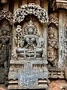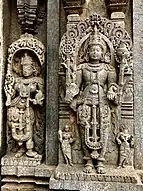 The south shrine entrance has two dvarapalas: Bhadra and Subhadra. The lintel above the entrance shows Venugopala. A 13th century Lakshminarayana carving is shown seated in the Sukhasana yoga pose, with him are chakra, conch, lotus and a gada (mace). Past the Sukhanasi, are Jaya and Vijaya, while the lintel shows a seated Vishnu and the canopy shows a dancing Vishnu.[38] The south garbha griya is 8'x8' feet square, but includes niches into the wall for more space. The image of Krishna in the sanctum is 4.5 feet high. He wears ear rings, necklaces, armlets, bracelets, finger rings, toe rings, anklets, girdle and jewelled diadem.[38] His legs are crossed, head slightly bent as he plays the bansuri (flute) he holds with both his hands. His fingers are in a tapping position, and all beings - from humans to cows, gods to goddesses inside the sanctum are depicted as absorbed in the divine music. Some figures are shown running to listen to the music, their clothes slipping off. Above the householders, gopis and cows are shown rishis (sages) who too are lost in the experience.[38]