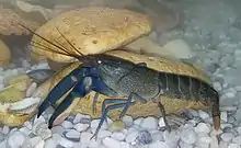 Cherax boesemani is a relatively large crayfish, adult body length is 5โ6 in (13โ15 cm).[2] Variable blues, reds, and oranges are the predominant carapace colours, which has led to extensive selective breeding to create new commercial strains, with names such as Blue Moon, Supernova, Papuan red, tricolor and Red Brick. Hybrids with C. pulcher commercially known as Thunderbolt Blue Moon are also available.[3]