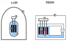 In power-generating operation, most of the heat generated in a nuclear reactor by its fuel rods is derived from nuclear fission, but a significant fraction (over 6%) is derived from the radioactive decay of the accumulated fission products; a process known as decay heat. This decay heat continues for some time after the fission chain reaction has been stopped, such as following a reactor shutdown, either emergency or planned, and continued pumped circulation of coolant is essential to prevent core overheating, or in the worst case, core meltdown.[18] RBMK reactors, like those at Chernobyl, use water as a coolant, circulated by electrically-driven pumps.[19][20] The coolant flow rate is considerable – Reactor No. 4 had 1661 individual fuel channels, each requiring a coolant flow of 28 m3/h (990 cu ft/h) at full reactor power, for a total of over 45 million litres per hour (12 million gallons per hour) for the entire reactor.
