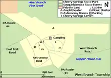 - Cherry Springs State Park (PDF) (Map). Pennsylvania Department of Conservation and Natural Resources. January 2008. Archived from the original (PDF) on June 10, 2011. Retrieved March 10, 2009. Note: One spring feeding Hopper House Run is between the Cherry Springs Tavern and the parking lot (photo), while another is between PA Route 44 and West Branch Road, just east of their junction (photo).
